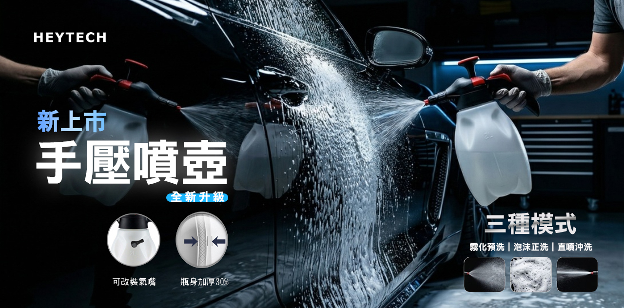 HEYTECH 黑炭洗美 2L 手壓泡沫噴壺,三種模式(霧化預洗 / 泡沫正洗 / 直噴沖洗),加厚防爆瓶身,可改裝充氣嘴,適合汽車美容店、DIY 洗車與居家清潔,24H 急速出貨。
